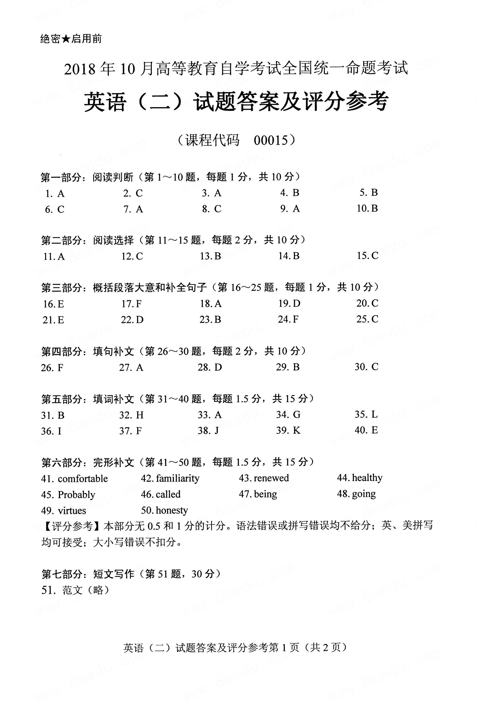 贵州省2018年10月自考00015英语二真题答案