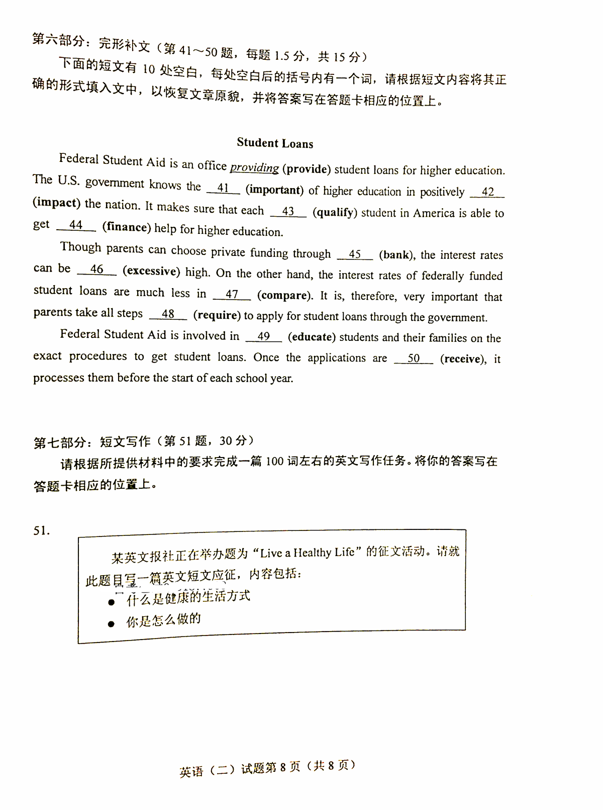 51. 某英文报社正在举办题为“Live a Healthy Life” 的征文活动。请就此题目写一篇英文短文应征,内容包括:什么是健康的生活方式? 你是怎么做到的?