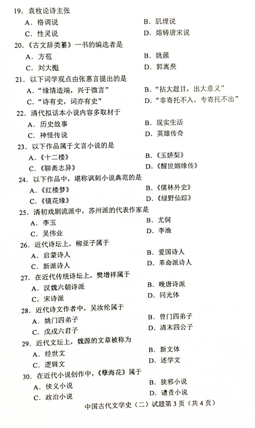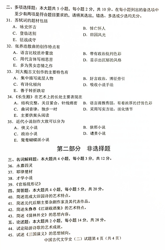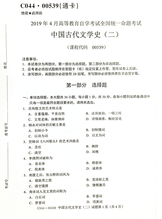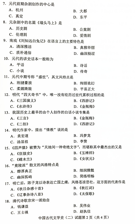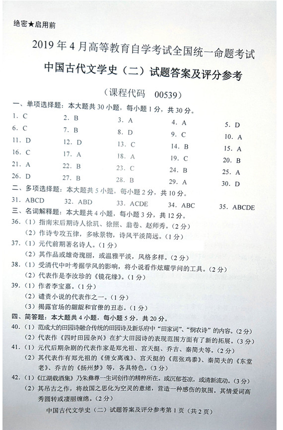 贵州省2019年04月自学考试00539中国古代文学史(二)历年真题及答案